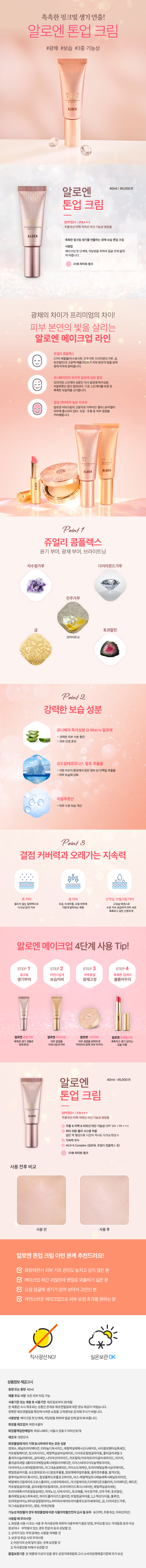 정제수, 페닐트라이메티콘, 티타늄디옥사이드, 에칠헥실메톡시신나메이트, 사이클로펜타실록세인, 카프릴릴메티콘, 징크옥사이드, 에칠헥실살리실레이트, 다이프로필렌글라이콜, 폴리글리세릴-5폴리리시놀리에이트, 글리세린, 나이아신아마이드, 카프릴릭/카프릭트라이글리세라이드, 마이카, 폴리글리세릴-3폴리다이메틸실록시에틸다이메티콘, 다이스테아다이모늄헥토라이트, 다이아이소스테아릴말레이트, 마그네슘설페이트, 아이소도데케인, 트라이메틸실록시실리케이트, 펜틸렌글라이콜, 슈도알테로모나스발효추출물, 알로에베라잎추출물, 콜라겐추출물, 쌀겨오일, 알루미늄하이드록사이드, 합성플루오르플로고파이트, 비스-에칠헥실옥시페놀메톡시페닐트리아진, 메틸메타크릴레이트크로스폴리머, 스테아릭애씨드, 아크릴레이트/다이메티콘코폴리머, 다이메티콘, 메티콘, 카프릴릴글라이콜, 글리세릴카프릴레이트, 트라이하이드록시스테아린, 에틸헥실글리세린, 트라이에톡시카프릴릴실레인, 아데노신, 틴옥사이드, 토코페롤, 자수정가루, 진주가루, 토르말린, 폴리메틸실세스퀴옥세인, 하이드롤라이즈드콜라겐, 부틸렌글라이콜, 1,2-헥산다이올, 풀루란, 테트라데실아미노부티로일발릴아미노부티릭우레아트라이플루오로아세테이트, 금, 다이아몬드가루, 마그네슘클로라이드, 향료, 적색산화철
