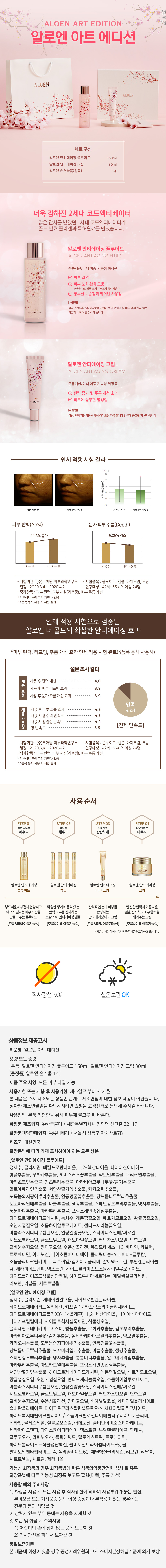 [알로엔 안티에이징 플루이드] 정제수, 글리세린, 메틸프로판다이올, 1,2-헥산다이올, 나이아신아마이드, 병풀추출물, 무화과추출물, 히비스커스꽃추출물, 약모밀추출물, 귀리커넬추출물, 아티초크잎추출물, 감초뿌리추출물, 아라비아고무나무꽃/줄기추출물, 알로에베라잎추출물, 서양산딸기잎추출물, 카카오씨추출물, 도둑놈의지팡이뿌리추출물, 인동덩굴꽃추출물, 당느릅나무뿌리추출물, 도꼬마리열매추출물, 마늘추출물, 생강추출물, 스페인감초뿌리추출물, 탱자추출물, 퉁퉁마디추출물, 마카뿌리추출물, 프랑스해안송껍질추출물, 하이드로제네이티드레시틴, 녹차수, 레몬껍질오일, 베르가모트오일, 왕귤껍질오일, 오렌지껍질오일, 소듐하이알루로네이트, 센티드제라늄꽃오일, 아틀라스시다나무껍질오일, 일랑일랑꽃오일,스타아니스열매/씨오일,시트로넬라오일,클로브잎오일,캐모마일꽃오일, 커먼자스민오일, 단향오일, 갈바눔수지오일, 장미꽃오일, 수용성콜라겐,옥틸도데세스-16, 베타인, 카보머,트로메타민,아데노신, 다이소듐이디티에이, 폴리쿼터늄-51,베타-글루칸, 소듐폴리아크릴레이트, 피브이엠/엠에이코폴리머, 말토덱스트린, 부틸렌글라이콜, 금, 세라마이드엔피, 덱스트린,하이드롤라이즈드소듐하이알루로네이트,하이드롤라이즈드식물성단백질,하이드록시아세토페논, 에틸헥실글리세린, 리모넨, 리날룰, 시트로넬올