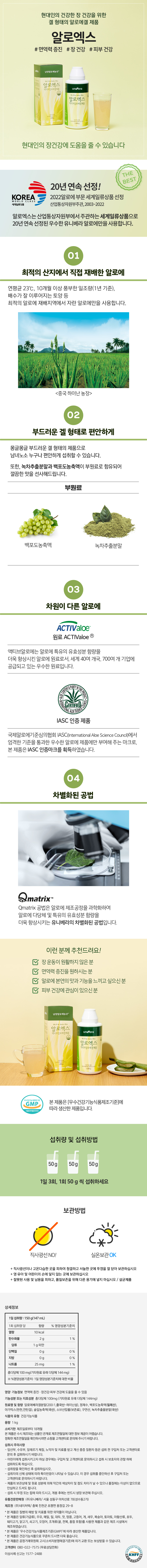 - 국제알로에 기준 심의협회(IASC) 인증 마크: 국제알로에 기준심의협회(IASC)에서 우수한 알로에 제품에만 부여하는 IASC인증마크입니다.