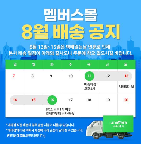 8월 13일 ~ 15일은 전국 택배없는 날 연휴 입니다. 본사 배송 일정이 아래와 같사오니 주문에 착오 없으시길 바랍니다.