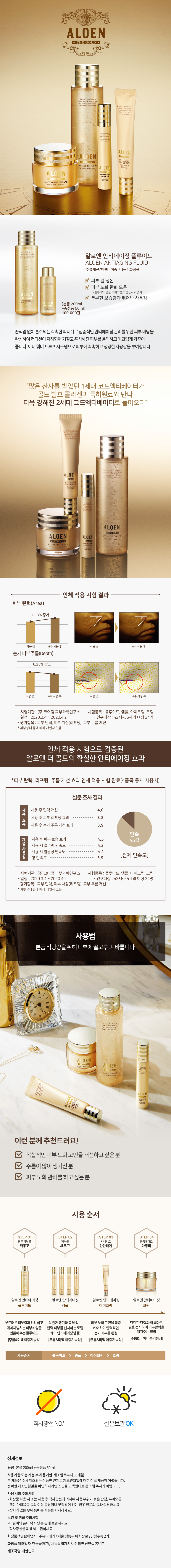 정제수, 글리세린, 메틸프로판다이올, 1,2-헥산다이올, 나이아신아마이드, 병풀추출물, 무화과추출물, 히비스커스꽃추출물, 약모밀추출물, 귀리커넬추출물, 아티초크잎추출물, 감초뿌리추출물, 아라비아고무나무꽃/줄기추출물, 알로에베라잎추출물, 서양산딸기잎추출물, 카카오씨추출물, 도둑놈의지팡이뿌리추출물, 인동덩굴꽃추출물, 당느릅나무뿌리추출물, 도꼬마리열매추출물, 마늘추출물, 생강추출물, 스페인감초뿌리추출물, 탱자추출물, 퉁퉁마디추출물, 마카뿌리추출물, 프랑스해안송껍질추출물, 하이드로제네이티드레시틴, 녹차수, 레몬껍질오일, 베르가모트오일, 왕귤껍질오일, 오렌지껍질오일, 소듐하이알루로네이트, 센티드제라늄꽃오일, 아틀라스시다나무껍질오일, 일랑일랑꽃오일, 스타아니스열매/씨오일, 시트로넬라오일, 클로브잎오일, 캐모마일꽃오일, 커먼자스민오일, 단향오일, 갈바눔수지오일, 장미꽃오일, 수용성콜라겐, 옥틸도데세스-16, 베타인, 카보머, 트로메타민, 아데노신, 다이소듐이디티에이, 폴리쿼터늄-51, 베타-글루칸, 소듐폴리아크릴레이트, 피브이엠/엠에이코폴리머, 말토덱스트린, 부틸렌글라이콜, 금, 세라마이드엔피, 덱스트린, 하이드롤라이즈드소듐하이알루로네이트, 하이드롤라이즈드식물성단백질, 하이드록시아세토페논, 에틸헥실글리세린, 리모넨, 리날룰, 시트로넬올